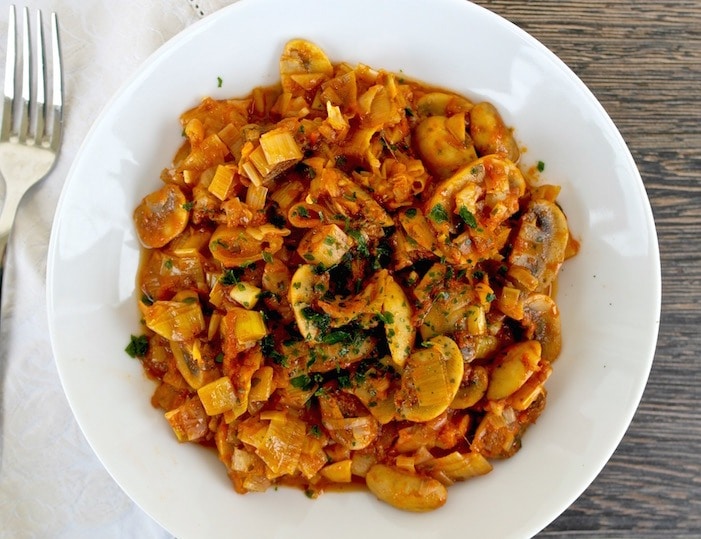 One Pot Greek Style Mushrooms And Leeks Manitaria Giahni